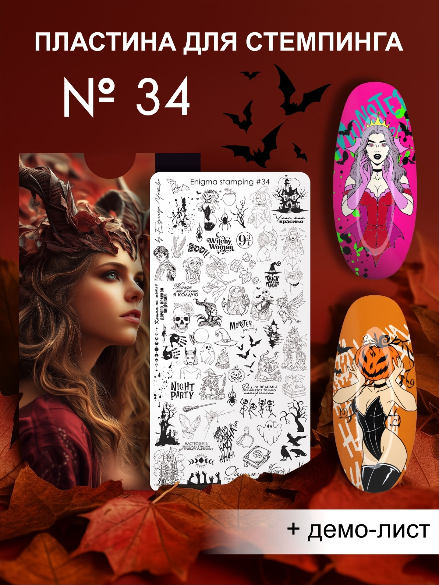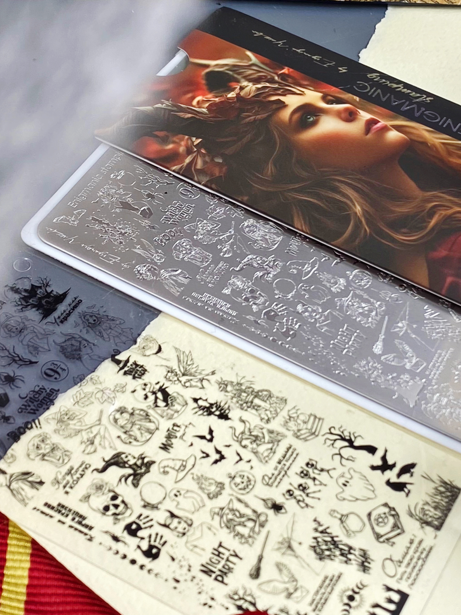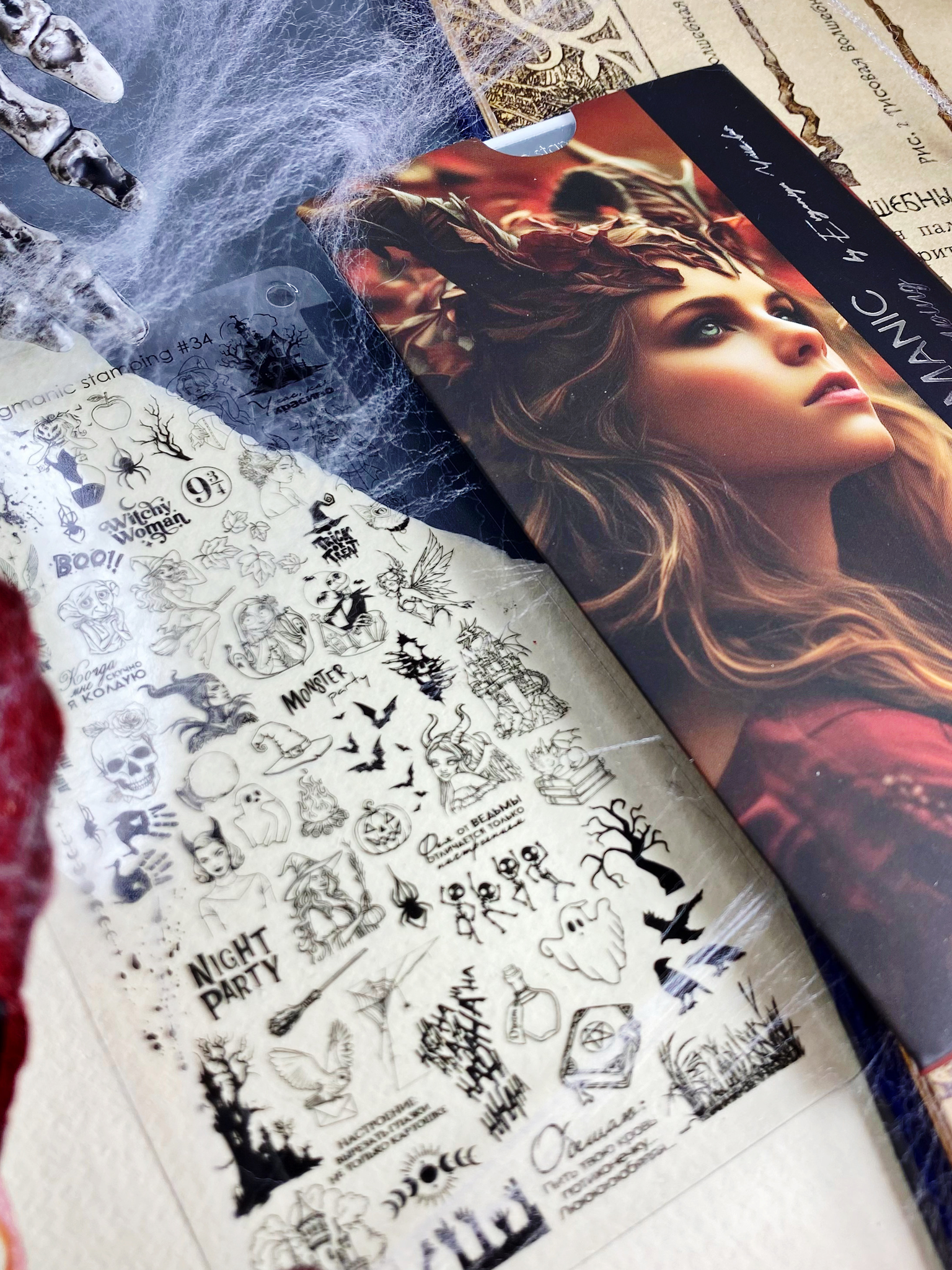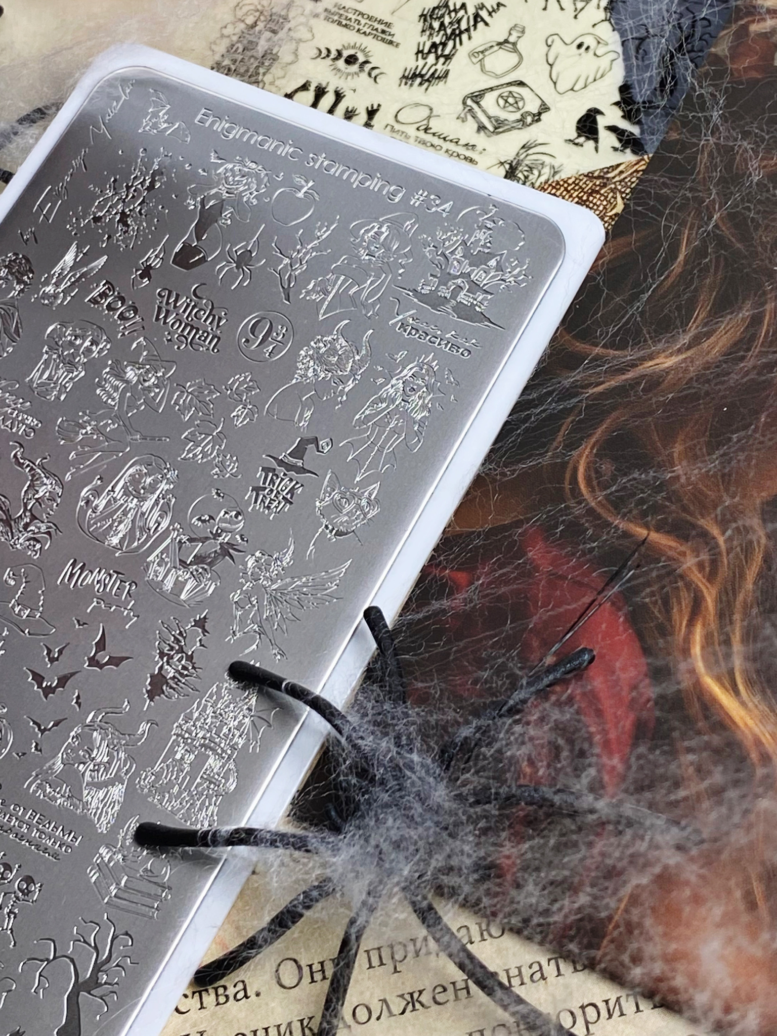What is autumn? It's a time for the magical creativity of stamping artists. When you can combine the natural beauty of autumn with the secret encounters of magicians and wizards in a single composition. We created Enigmanic stamping plate #34 so you can create unique compositions, intertwining terrifyingly beautiful fairy tales and stories with an autumnal flair. This plate features Halloween-themed characters, fairy tales, witches and sorceresses, and prints for creating landscapes and multi-layered designs. We've enhanced the plate with small details and secondary elements to create a cohesive composition. We've also added a variety of inscriptions in English and Russian.