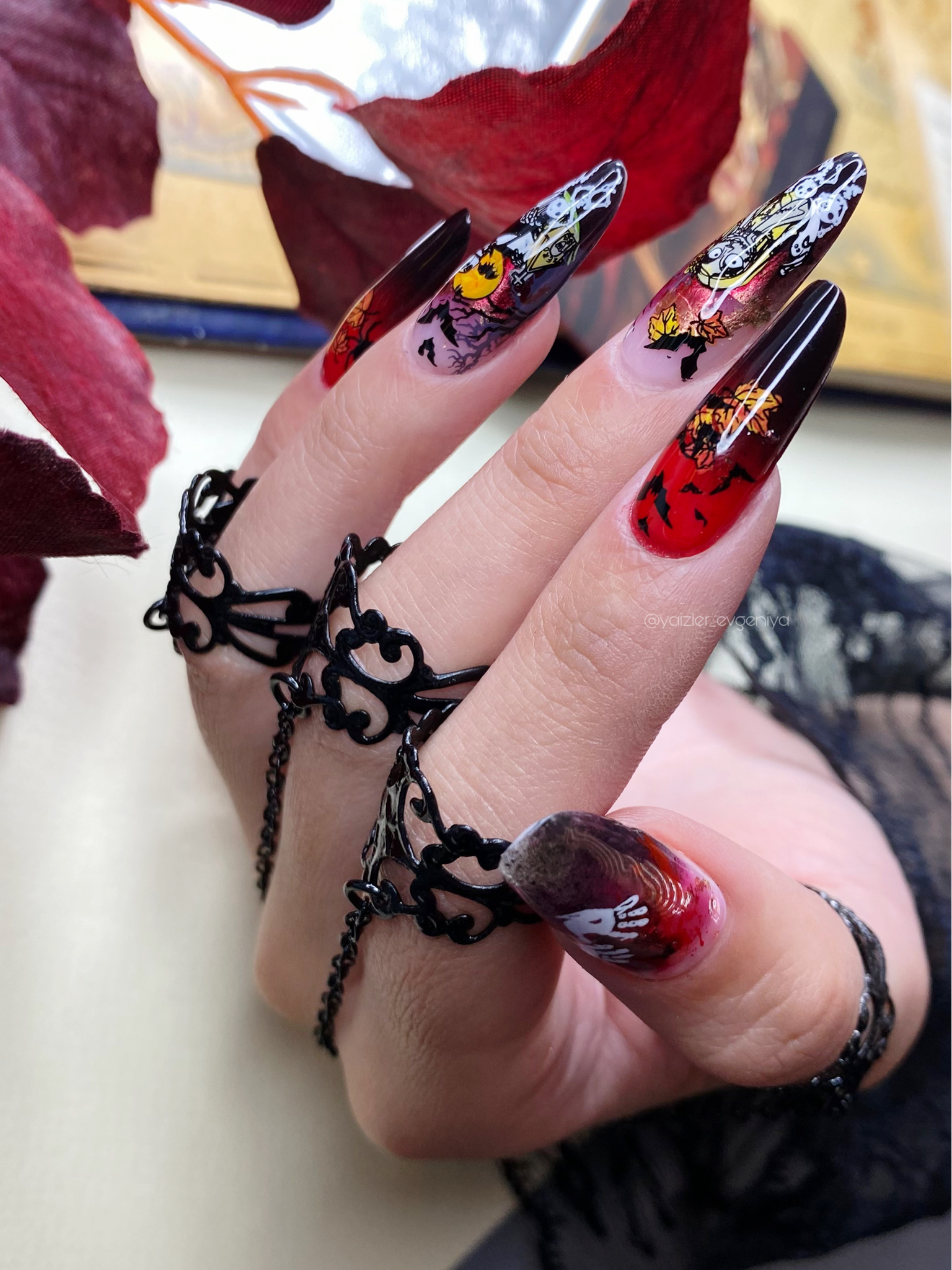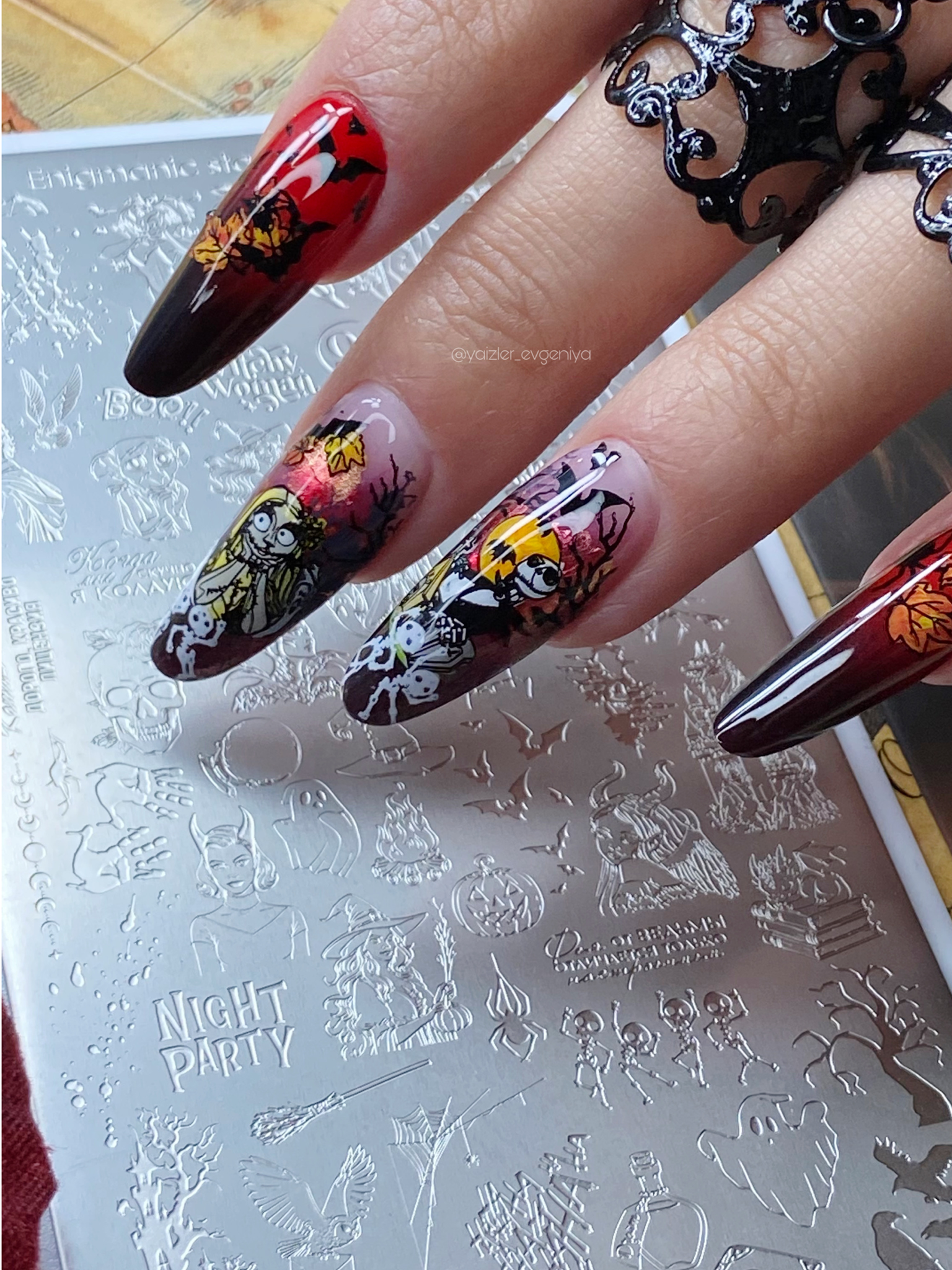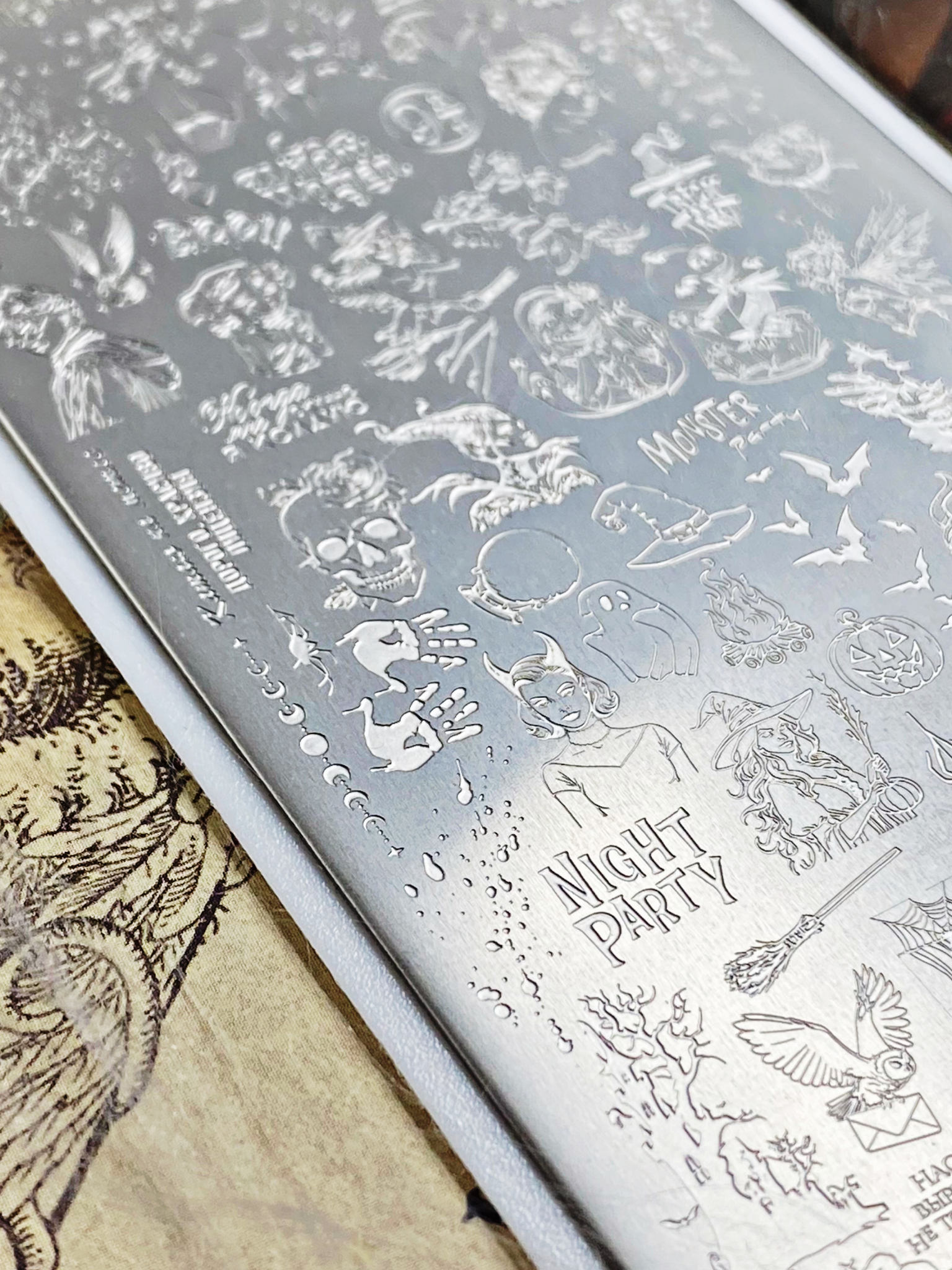 Working with this plate guarantees magically beautiful compositions. Fine lines, unique prints, recognizable characters, and high-quality engraving make working with it quick, easy, and enjoyable. Clients who want to create unique designs on their nails will love this plate, choosing it not only for the fall season. Plate #34 is easily compatible with plates from our collection and is a worthy addition to the arsenal of both professionals and experts in stamping design, as well as beginners. We recommend pairing it with plate #30. With its terrifyingly beautiful prints, it's already waiting to be used this fall!